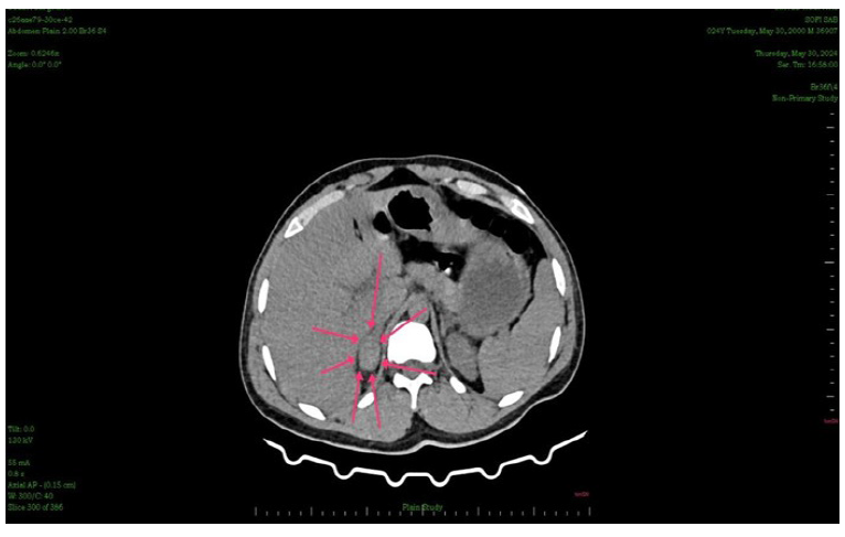 CT scans were used to measure adrenal haematomas and classify them as irregular, oval, or circular. Other CT findings, including the enhanced area within the haematoma and associated injuries, were also evaluated (Figure 3 and 4).