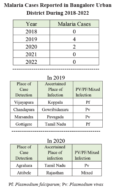 Background: Malaria continues to pose a significant health challenge in India, despite ongoing control and elimination initiatives. The disease affects health systems, economies, and communities, particularly in areas with favorable environmental conditions. While surveillance and vector control interventions have significantly lowered malaria incidence at both the state level and in Bangalore Urban, persistent challenges continue to impede complete eradication.
