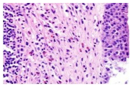 A contrast enhanced CT scan of the KUB region revea-led a 4 mm polyp arising from the bladder base near the left vesicoureteric junction, with normal upper urinary tracts. Cystoscopy confirmed these findings, and a transurethral resection of the polyp was performed. Histological examination revealed subepithelial infiltration of inflammatory cells, predominantly eosinophils. Postoperatively, the patient was started on oral antibiotics for two weeks and remained asymptomatic at nine months of follow-up. Treatment with prednisone was not considered.