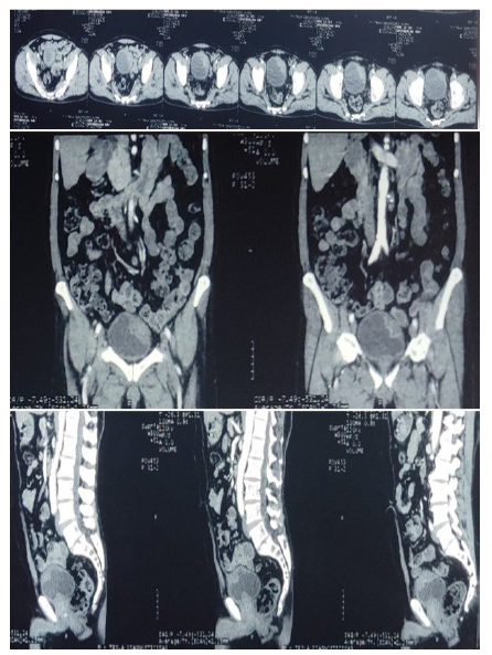 Contrast enhanced CT scan of KUB region revealed an irregular, heterogeneously enhancing lesion measuring 5.2 X 4.8 X 2.5 cm, arising from the anterior and left lateral walls of the urinary bladder. The differential diagnosis included carcinoma of the bladder (Figure 2).