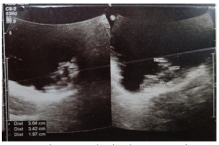 A 64-year-old male presented to our department with complaints of poor urinary stream, frequency, and dysuria. He had no known medical comorbidities. Urinalysis revealed pyuria, microscopic haematuria and positive nitrites. He was initially started with antibiotics and ultrasonography was ordered, which revealed focal, polypoidal, irregular wall thickening of the anterior wall of bladder with prostatomegaly and median lobe hypertrophy (Figure 1).